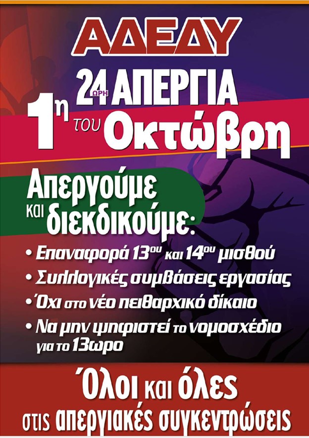 24ωρη απεργία αποφάσισε για αύριο Τετάρτη 1η Οκτωβρίου η ΑΔΕΔΥ καλώντας σε μαζική συμμετοχή.