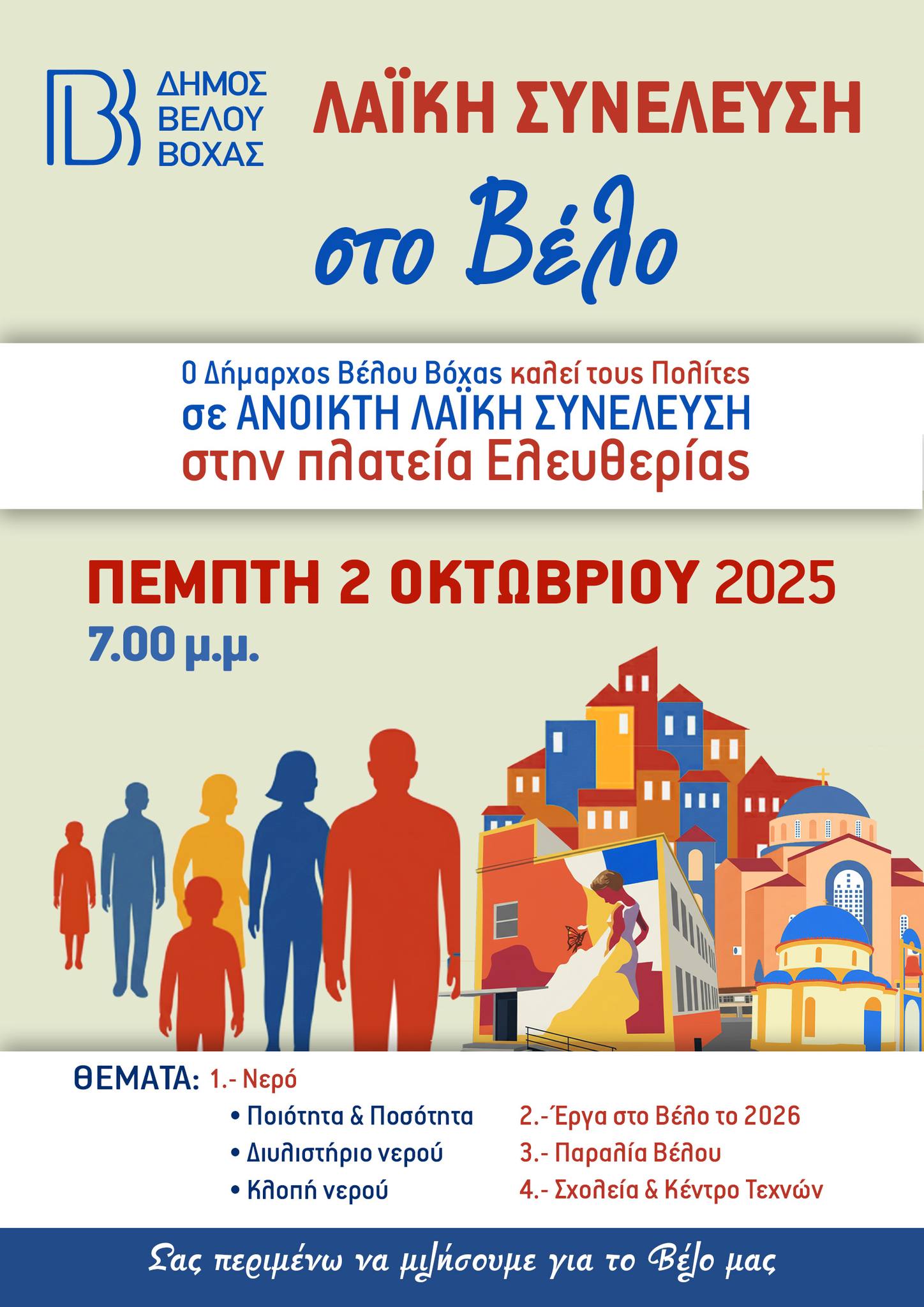 Όπως ανακοίνωσε χθες το γραφείο Τύπου του Δήμου Βέλου – Βόχας, η προγραμματισμένη για σήμερα Πέμπτη 2 Οκτωβρίου 2025 Λαϊκή Συνέλευση στο Βέλο αναβάλλεται, λόγω της χειρουργικής επέμβασης του Δημάρχου Αθανασίου Μανάβη. Η νέα ημερομηνία θα ανακοινωθεί σύντομα.