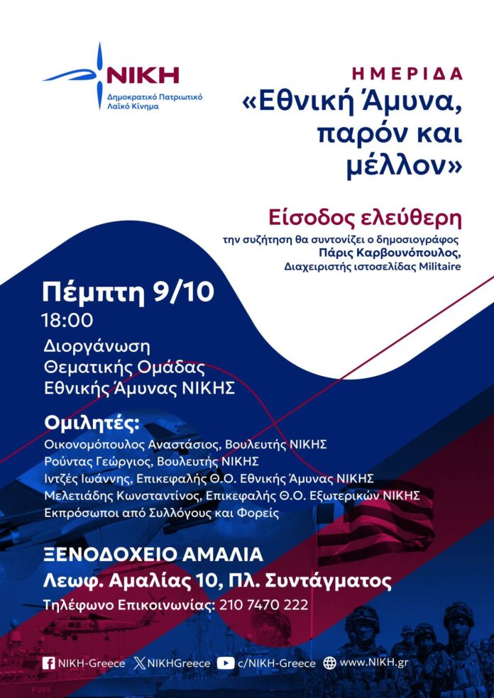 Ο Γιώργος Ρούντας, Αντιπρόεδρος και Βουλευτής Λαρίσης του Πατριωτικού, Λαϊκού, Δημοκρατικού Κινήματος “Νίκη” θα είναι ένας από τους ομιλητές της Ημερίδας που θα πραγματοποιηθεί την Πέμπτη 9 Οκτωβρίου στο ξενοδοχείο “Αμαλία” στην πλατεία Συντάγματος με θέμα: “Εθνική Άμυνα, παρόν και μέλλον”.